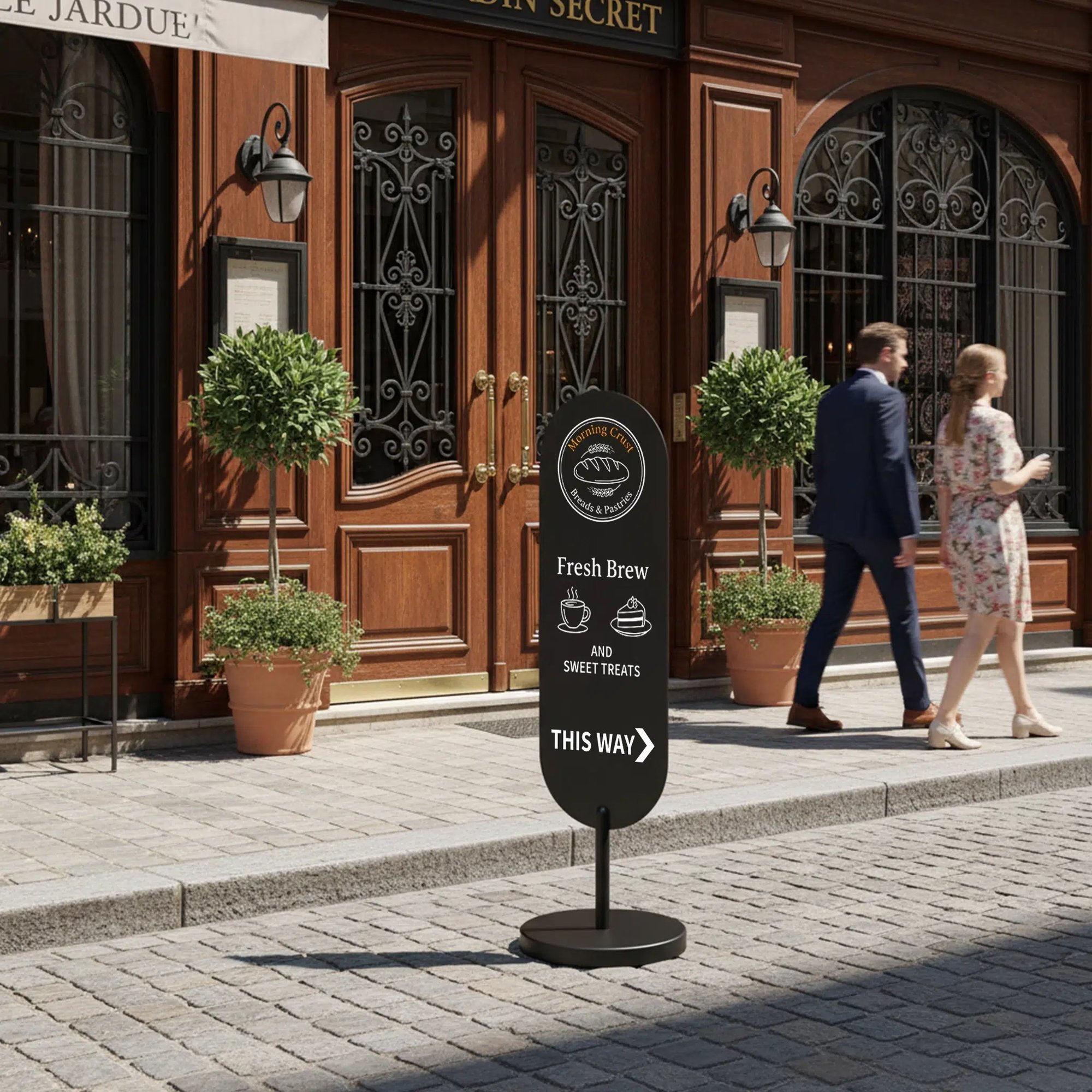 Meet the Mira Oval Standing Sign—a slim, rectangular curve footpath sign that turns heads without blocking walkways. Designed for modern storefronts, cafés and events, its tall oval face gives more vertical real estate for logos, menus and directional messages while keeping a compact footprint.