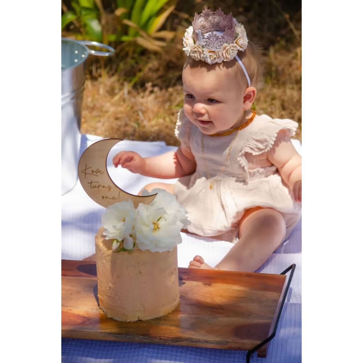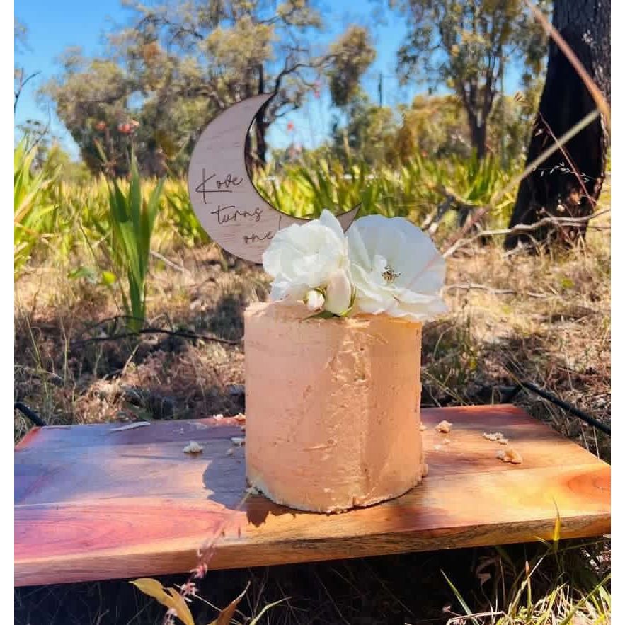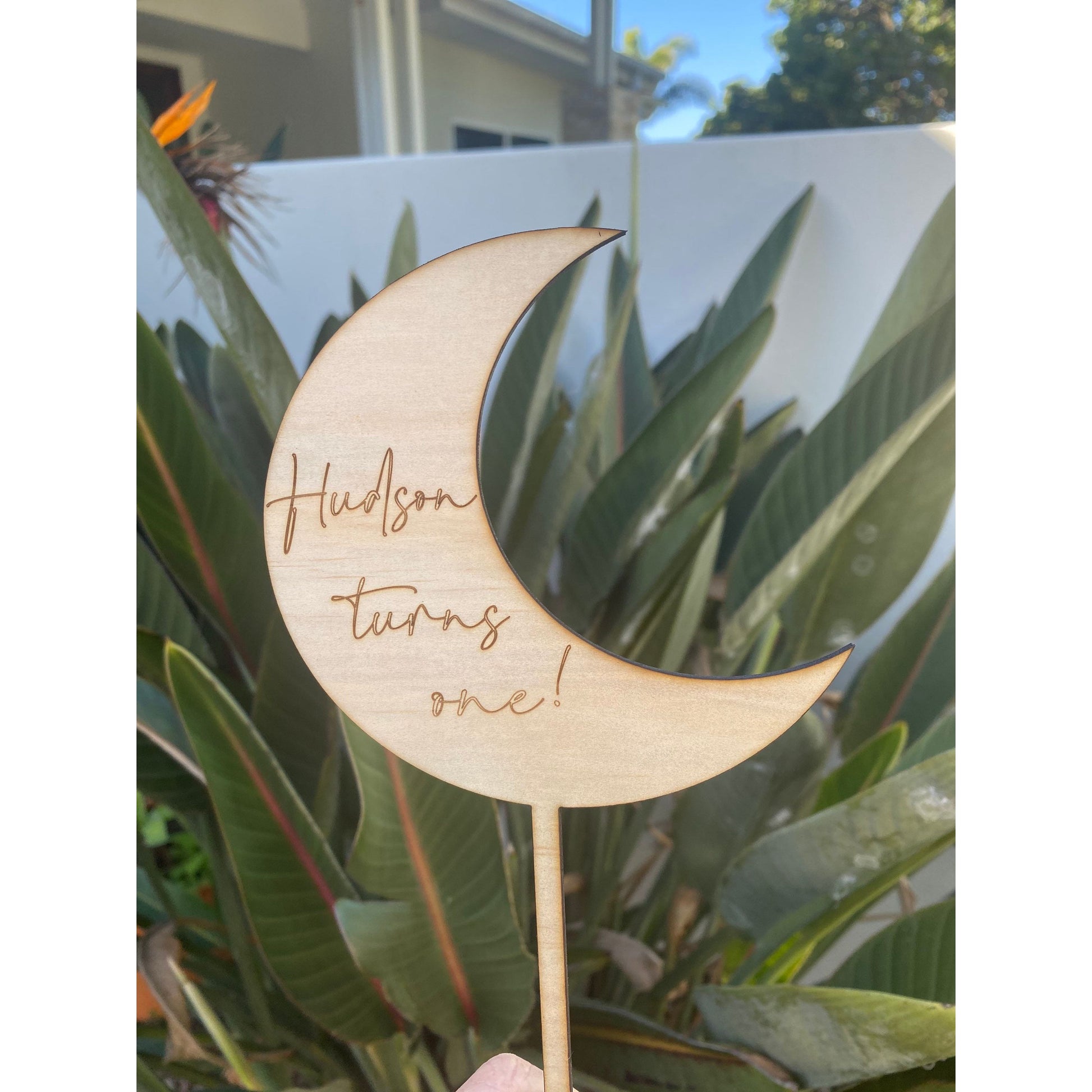 This wooden moon cake topper is approx. 12cm wide (up to 6 letter names) or 15cm wide (longer names)